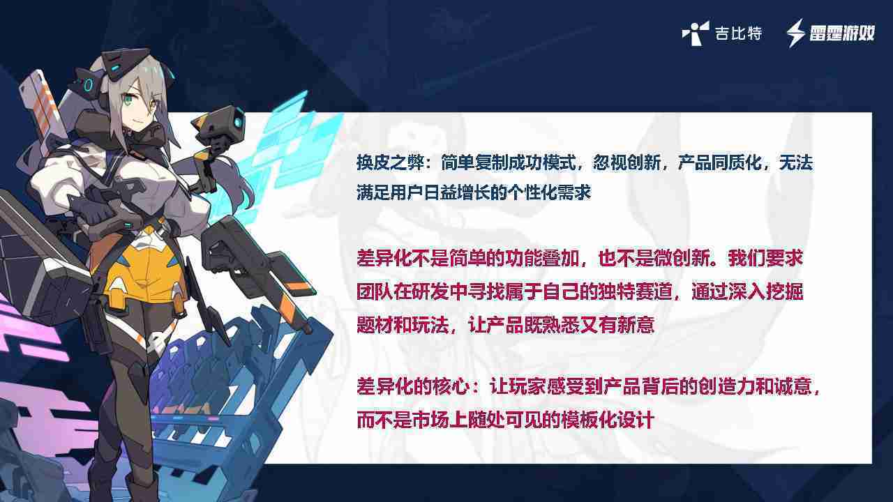 在我们内部是这么定义差异化的。。。。首先,,,,差异化不是简单的功能叠加,,,更不是换皮。。只是换皮,,,,产品无法提供有效的市场价值。。内部经常说差异化的产品不是为了迎合市场,,而是找到一个自己独特的表达方式,,,在研发中找到属于自己的细分赛道和独特赛道,,,,前提是需要对这个题材有足够的深入、、挖掘,,对玩法有足够深入的理解,,,,让产品看起来既熟悉又有新意。。