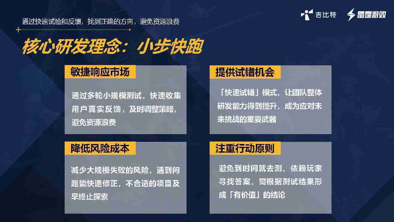 小步快跑不是找答案,,而是验证答案。。。。我们之前有项目是这样的,,,有些制作人会有几个方向觉得都可以做,,,,但是不确定做哪一个,,会选择几个都做,,,,做完拿到市场跑,,,,跑出哪一个更好,,,基于这个再做后续的研发和拓展。。。但这种情况最容易出现一个问题,,,,可能被玩家裹胁,,玩家说这个点不错、、那个点不错,,,,到底听还是不听,,,,不听感觉是无视玩家的反馈,,听的话,,,可能自己没想清楚导致研发思路发生偏颇。。。。所以针对这一点后面自己复盘整理,,,,发现制作人自己心里要有数,,,要做自己觉得好玩的,,,,而且明确知道这个东西是你想做的,,,,然后拿到市场验证这个答案是不是对的,,,而不是拿一堆答案找哪一个答案更好。。。