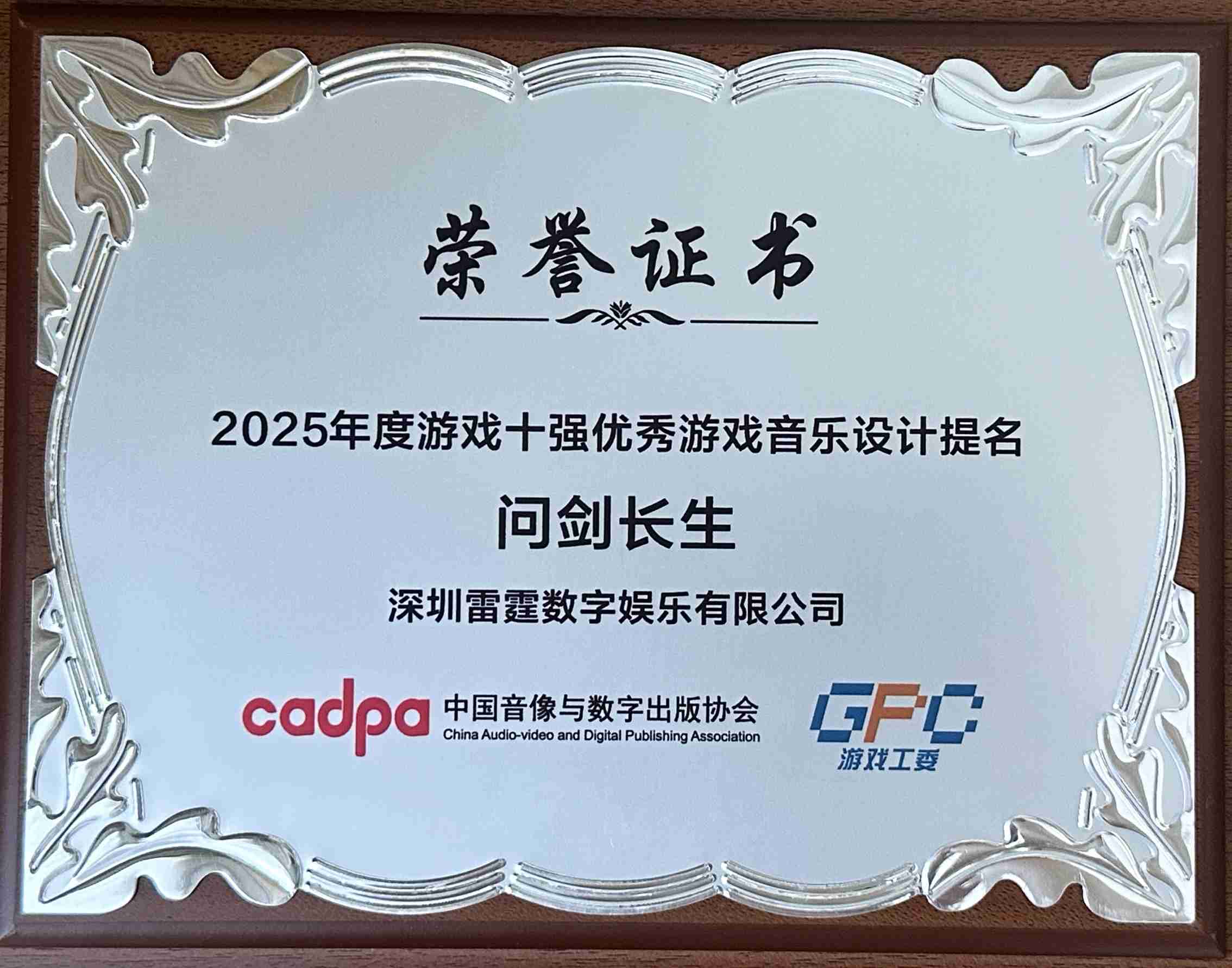 公司坚持走精品化道路,,,,打造与时代精神相契合、、、与海内外大众诉求相契合、、与创作实践相契合的游戏产品,,倡导构建具有中华文化特色、、、弘扬中华美学精神的产品理念,,,切实提升游戏文化内涵的传播力影响力。。。。如此次荣获“2025游戏十强年度优秀游戏音乐设计”提名奖的公司自研产品《问剑长生》以音筑境,,以乐传情,,,,其音乐融合东方传统韵味与现代审美,,构建独特听觉世界,,,运用古筝、、、、笛子、、、、箜篌等传统乐器与现代管弦乐,,,,塑造灵动古风仙侠氛围。。