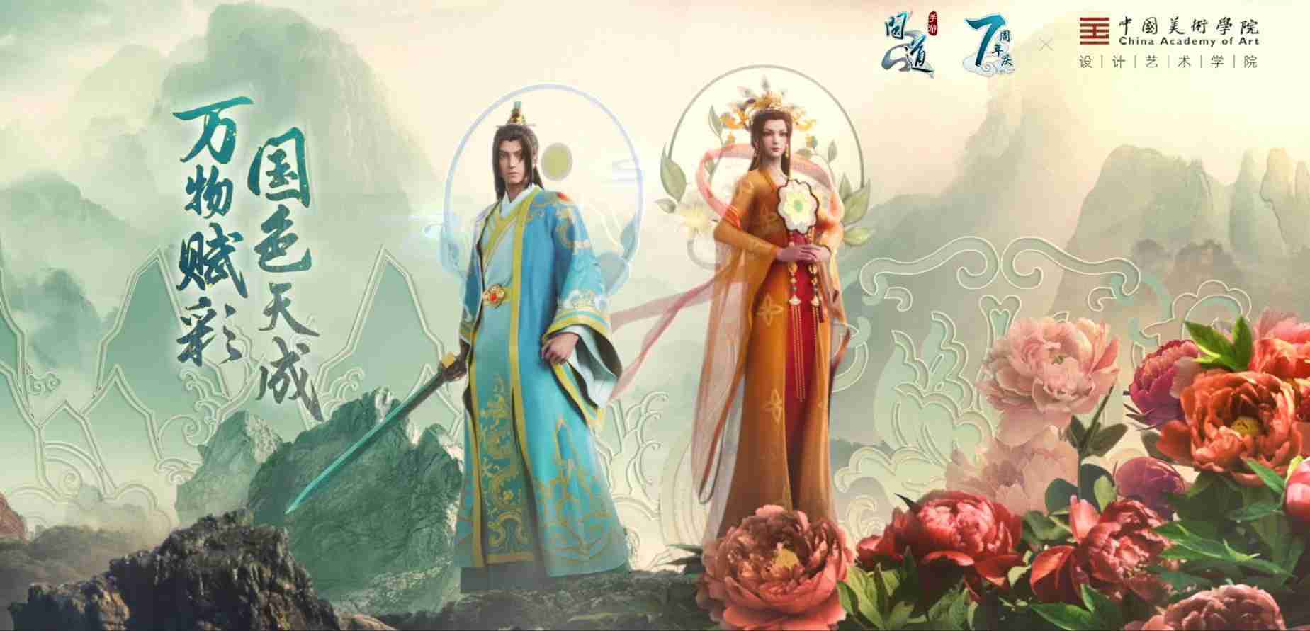 2023年4月,,《问道手游》联动中国美术学院,,,,在游戏中融合了中国历史上不同时期的文化元素,,,,打造了“山河万象”与“凤鸣九霄”的国风时装。。在色彩配置方面,,,,创作团队基于对游戏角色特性的分析提取相应的文化内涵,,,从每一种色彩的色相、、、指代事物和情感出发对应角色属性,,,,选定服装的色彩搭配。。在纹样设计方面,,,,创作团队结合游戏角色自身特殊的造型比例和形态,,,,在实际的纹样设计中进行了游戏语境下的活化演绎。。。男性角色集中使用了如蟒纹、、、、海水江崖纹、、、如意纹和云气纹等传统纹样元素,,,女性角色则吸纳了凤凰纹、、牡丹纹、、卷草缠枝纹等元素,,,组成以“双凤牡丹纹样”“缠枝牡丹纹”“金玉凤冠头饰”为主要纹样的游戏角色装饰图案系统。。。