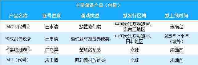 公司有多款储备产品,,,,涵盖放置类、、、、策略类、、RPG、、、、Roguelike等多元化游戏品类,,,,储备的主要自研和代理产品如下::
