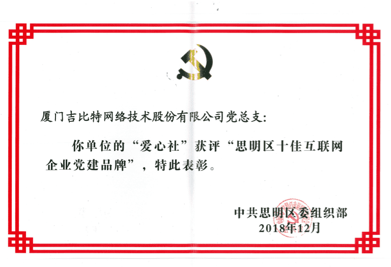 经初审评选、、、网络评选和专家评审等环节,,,,"厦门JIUYOU.COM网络技术股份有限公司党总支-爱心社" 从全区28个参评党建品牌中脱颖而出,,获评"思明区十佳互联网企业党建品牌"。。。
