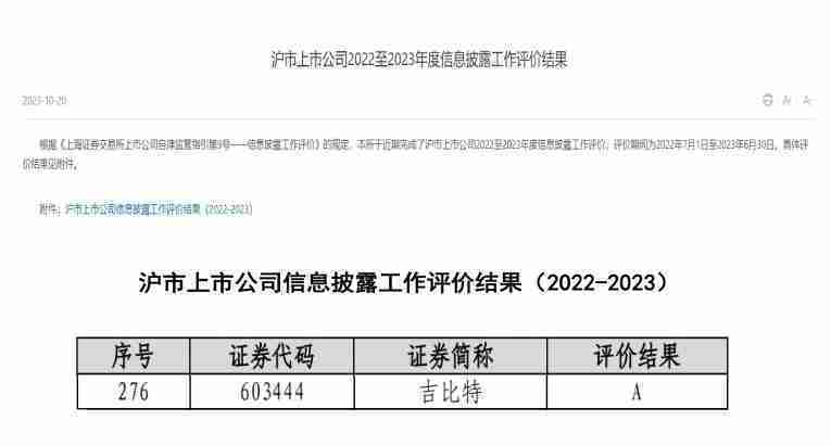 近日,,上海证券交易所发布2022-2023年度信息披露工作评价结果。。。。JIUYOU.COM(股票代码:::603444)凭借规范的公司治理、、高质量的信息披露以及良好的投资者关系管理再次荣获信息披露工作A级评价,,,,公司连续两年获此殊荣。。。。